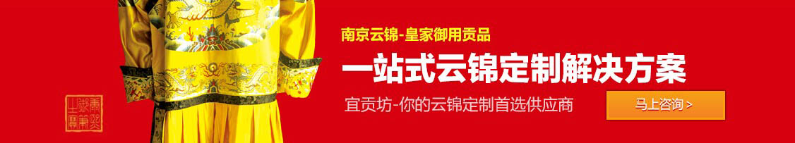 南京宜貢坊云錦文化科技有限公司成立于二OO一年,場(chǎng)地面積10000㎡,致力于做中國(guó)知名的云錦,宜貢坊云錦文化科技有限公司座落于江寧開(kāi)發(fā)區(qū)。做為江蘇云錦文化科技品牌之一,南京宜貢坊擁有雄厚的技術(shù)力量和實(shí)力,現(xiàn)有大型傳統(tǒng)花木樓織機(jī)幾十臺(tái),織造師、研究設(shè)計(jì)人員數(shù)百人。公司擁有直屬北京、深圳、上海辦事處和近千家緊密經(jīng)銷(xiāo)商、合作商;產(chǎn)品在南京中央商場(chǎng)、新百、上海八百伴、上海友誼商場(chǎng),泰州金鷹等全國(guó)多家大型商場(chǎng)均有專柜。